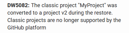 When repositories containing **projects (classic)** are restored to an organization that does not support this feature, **direct restoration in the original format is not possible**. Instead, the system converts the restoration from **projects (classic)** to **projects v2**.