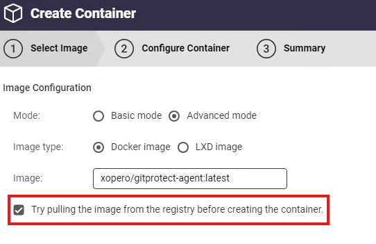 3. Ensure the **Try pulling image from the registry before creating the container** option is checked, and hit **Next**.