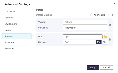 8. Navigate to **Storage** tab — here you can mount your **QNAP** volumes to the **GitProtect** **worker Docker** container.