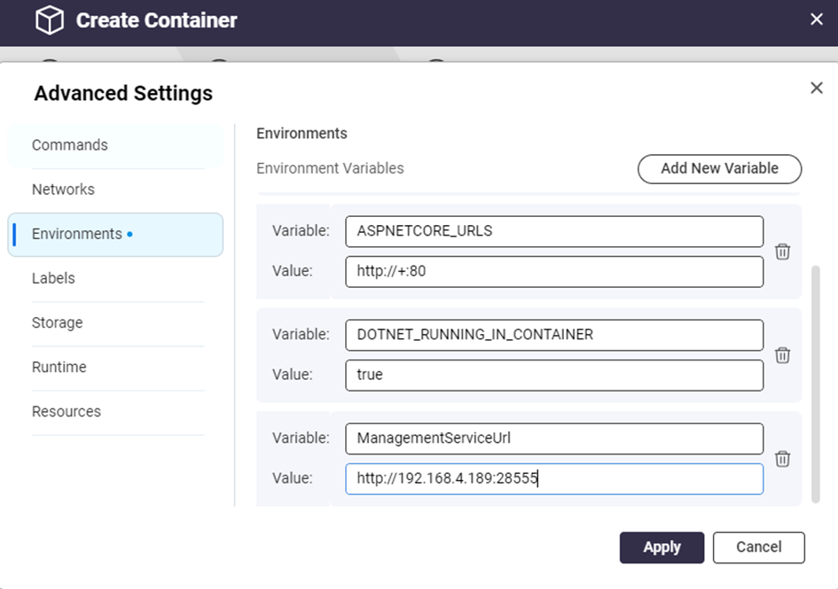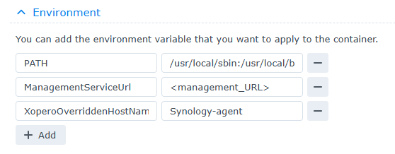 8. Next, in the **Environment** section, define the required variables:
