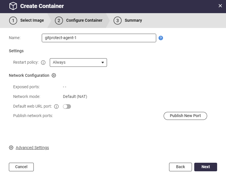 5. In the **Configure Container** tab, navigate to ⚙️**Advanced Settings**.