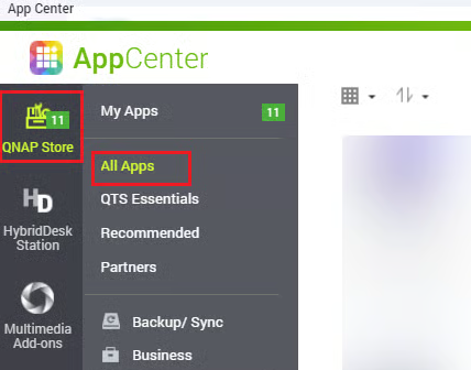 2. Login to your **QNAP** web panel and open the **AppCenter** application. In **QNAP Store**, select **All Apps** and search for the **Container Station**.