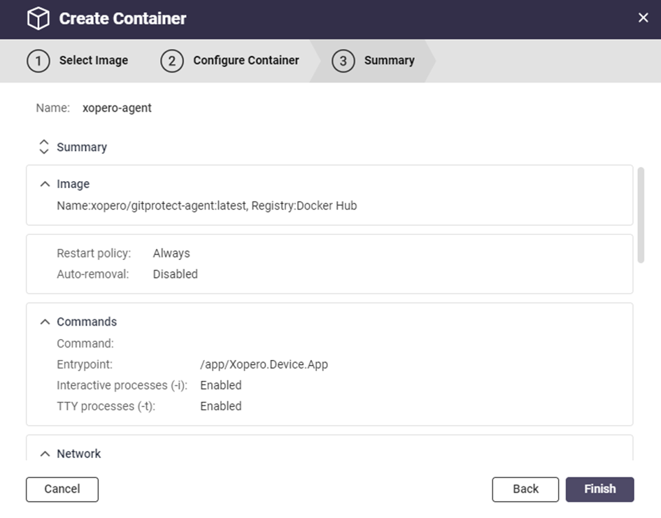 9. Next, double-check and confirm your settings, then click **Finish** to create the container.