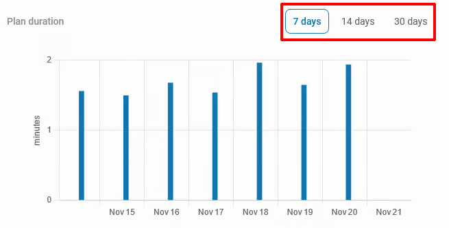 2. **Plan duration** — the chart shows the times at which backup tasks were performed. You can view this information for intervals of **7**, **14**, or **30** days, making it easy to compare whether tasks are completing within a consistent time frame or taking unusually long.
