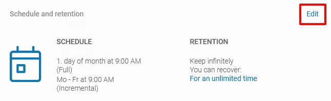6. **Schedule and retention** — displays the backup plan’s schedule and retention settings. You can view and edit these settings here if needed.