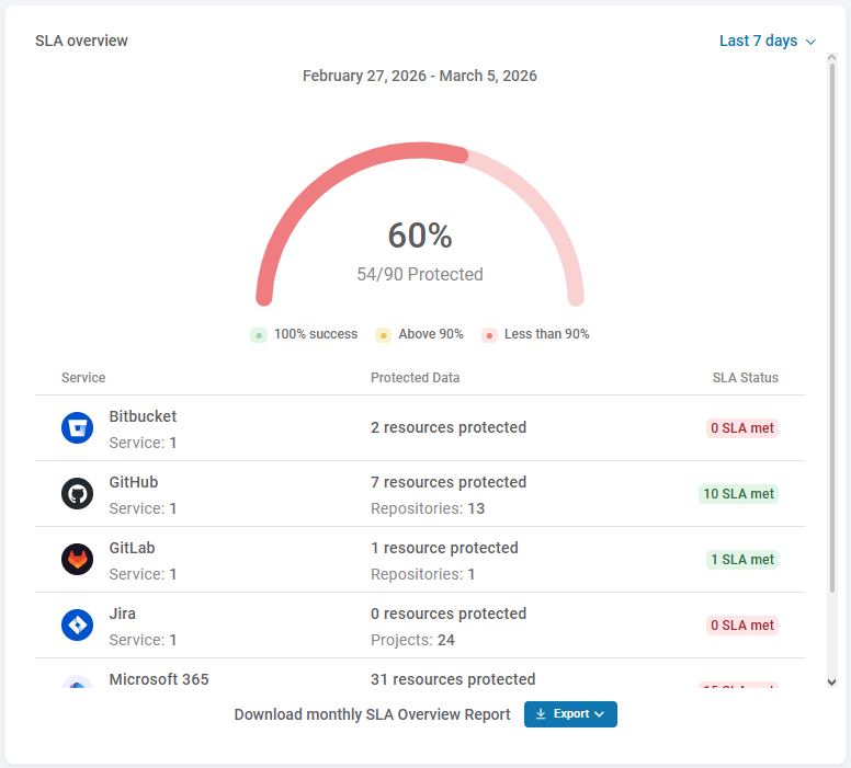 The list below the gauge chart displays the SLA status broken down by specific types of protected environments, such as: **DevOps**, **Microsoft 365**, and **Jira**. Resources with at least one successful backup within the selected time frame are considered to have met the SLA.