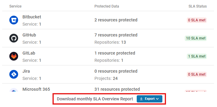 To export the SLA monthly report, click the **Export** button located below the services list and select the desired time frame. The SLA report will open in a separate window — review its contents, click the **Download** button in the top-right corner, and save the report using the **Save as PDF** option.