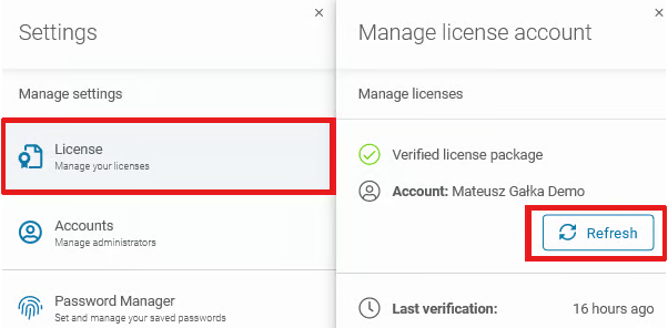 To refresh your license, click ⚙ **Settings** at the bottom-right of the left-side menu, select **License**, then click **Refresh** button under the selected verified license package.
