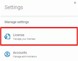To view your license details, click ⚙ **Settings** at the bottom-right of the left-side menu, and select **License**.